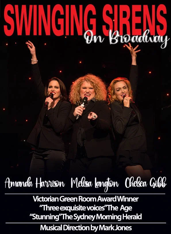 The SWINGING SIRENS are Amanda Harrison (Wicked, Sunset Boulevard), Chelsea Gibb (Chicago, Cabaret) and Melissa Langton (We Will Rock You, The Fabulous Singlettes).
